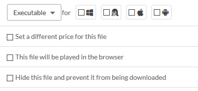 You can also set a platform, the price for each file you upload if you want. \<note tip\>Don't forget to set the engine in the metadata of your game by adding the **GDevelop** tag! It will appear in this page on Itch.io, the [games made with GDevelop.](https://itch.io/games/made-with-gdevelop)