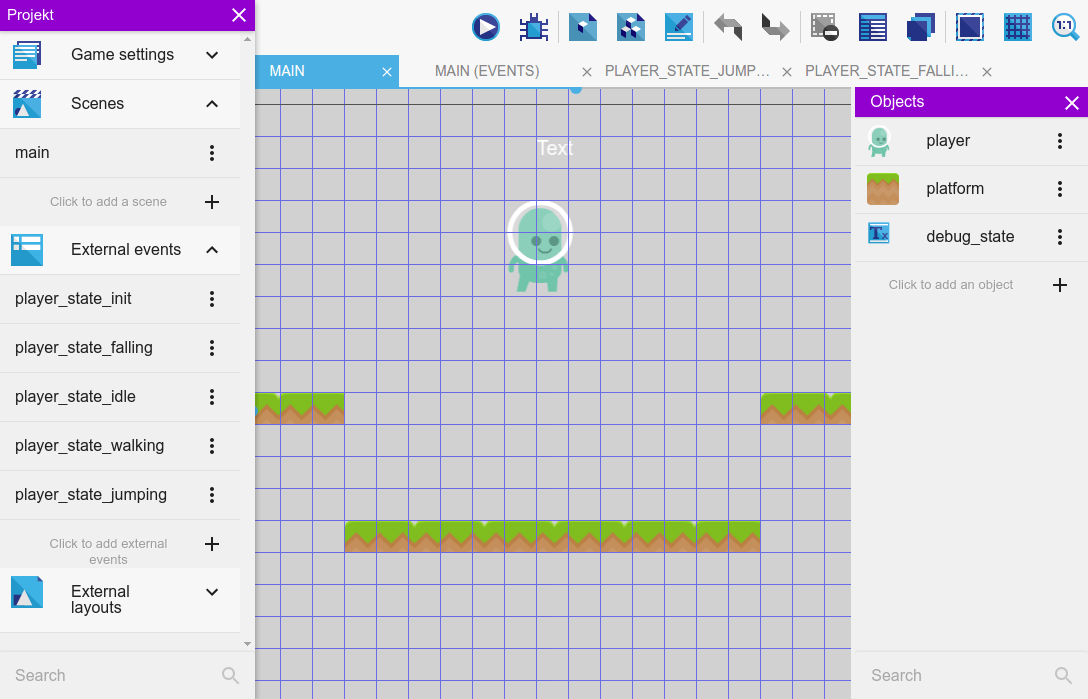 So let's get started by downloading the assets from the “” tutorial. Create a player as a “platformer object” and some platforms (“platform” behavior) to walk and jump on as described in the above-mentioned tutorial. Open the properties of the player object and create the animations “idle”, "walking","jumping" and "falling". Then create a string variable on the player object and call it “direction” with the value “right”. Switch to the event editor (“main” scene) and create these external events “playerstateinit”, “playerstatefalling”, “playerstateidle”, “playerstatewalking”, “playerstatejumping”. In the events of your main scene create a new event group from the drop-down menu on the right-hand side. Name it “Player logic”. Now add a "At the beginning of the scene" condition. Add a sub-event to the condition and link in the external event sheet “playerstateinit” via the “add”/”other” button. Do the same for all the other player states.